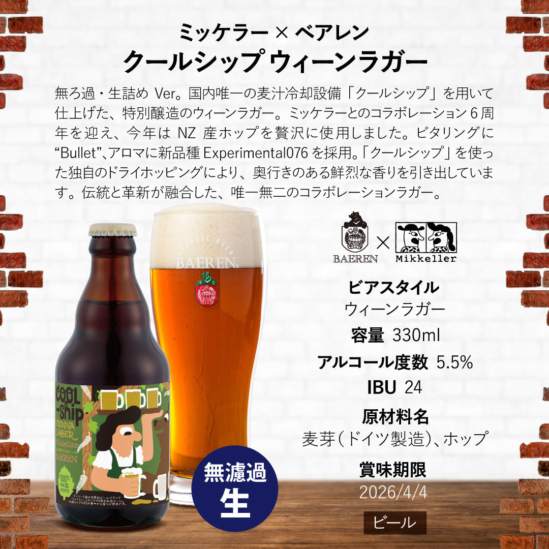 ベアレンが所有する醸造設備「クールシップ(麦汁冷却槽)」を使用した伝統的なウィーンラガー。デンマーク発、世界の名だたるブルワリーとコラボし、ビール業界に旋風を巻き起こすミッケラーとベアレンのコラボレーション6周年を記念したスペシャルバージョン。